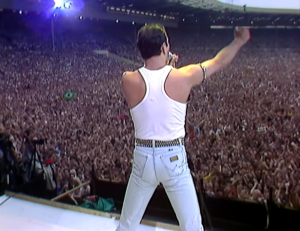 • Chi? Settantacinque artisti in tutto: la crema di quegli anni, con un occhio particolare alle band e ai frontmen che avrebbero potuto attirare più attenzione e donazioni. L’elenco dei partecipanti si trova facilmente in rete: ma alcune esibizioni meritano più di altre la citazione. Gli Status Quo, che aprono il concerto; Elvis Costello, che presenta “All You Need Is Love” dei Beatles come “una canzone folk inglese“; Elton John, scoppiettante e dinamico, che duetta con George Michael; il Duca Bianco, David Bowie, col suo carisma e la sua eleganza disumana, e la potentissima “Heroes”; gli U2, con Bono che improvvisa un ballo con una ragazza, appena scampata a uno schiacciamento contro le transenne; le reunion provvisorie di Crosby, Stills & Nash, Black Sabbath e Led Zeppelin. E poi, soprattutto, i Queen, che, con un ginnico Mercury in baffi e canotta, e con un’esibizione di 20 minuti scarsi, firmano la miglior performance del concerto: un momento di classe assoluta, coinvolgente e energico, tanto da essere esplicitamente citato, fotogramma per fotogramma, nel film “Bohemian Rhapsody”.